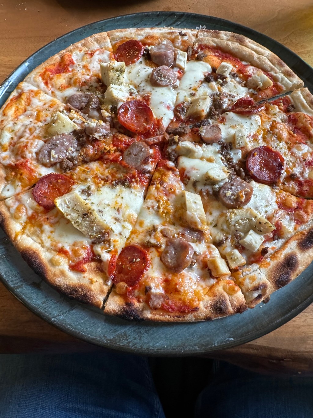 I went for the Meaty Pizza on a gluten-free base (obviously), and wow, it did not disappoint. Picture this: tomato sauce, gooey mozzarella, spicy pepperoni, juicy chicken, tender beef, and flavorful Italian sausage, all on a perfectly crisp crust with just the right amount of crunch and texture. Absolute perfection.